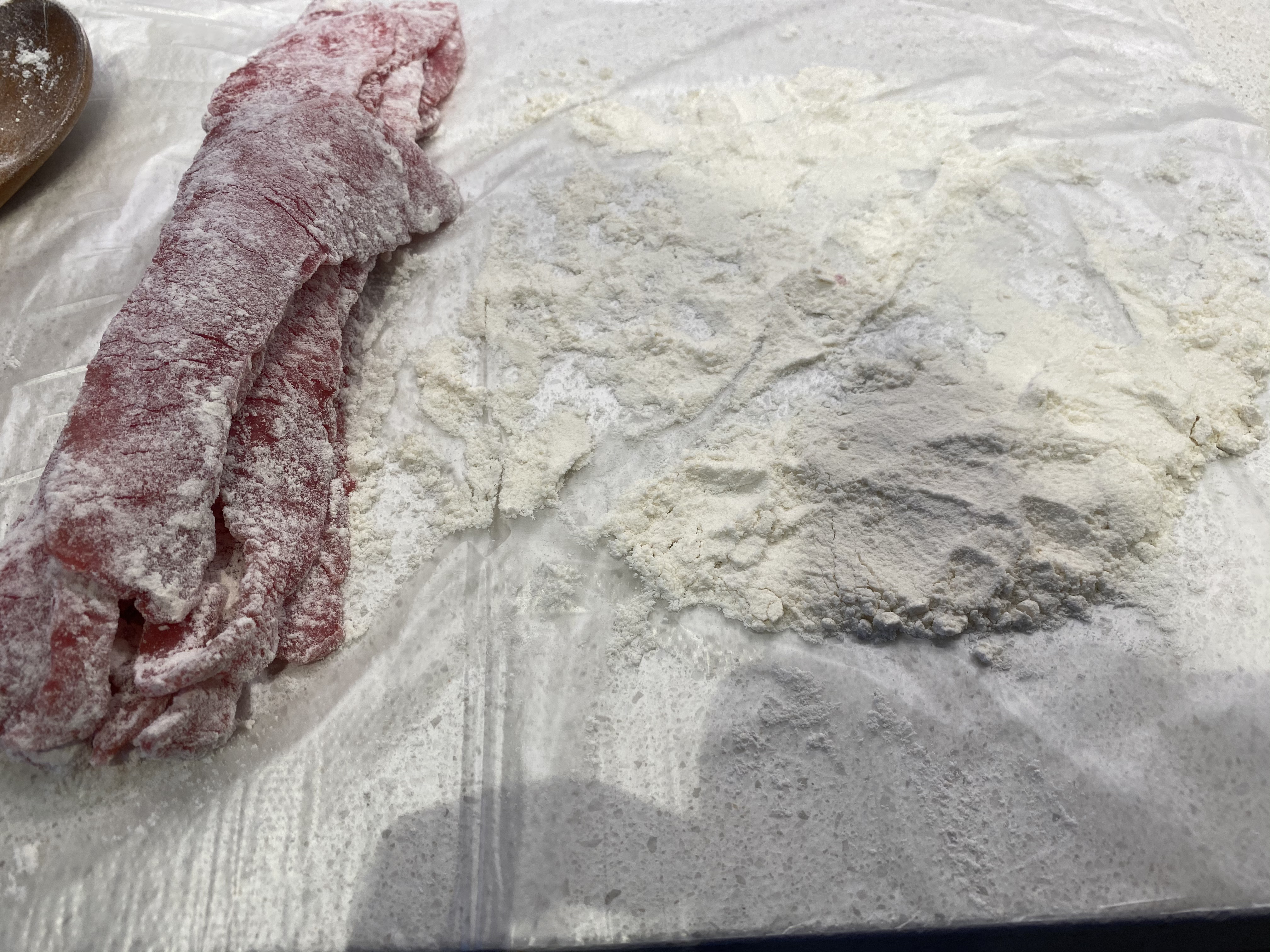 3. 고기에 밀가루 옷을 얇게 입혀 줍니다.