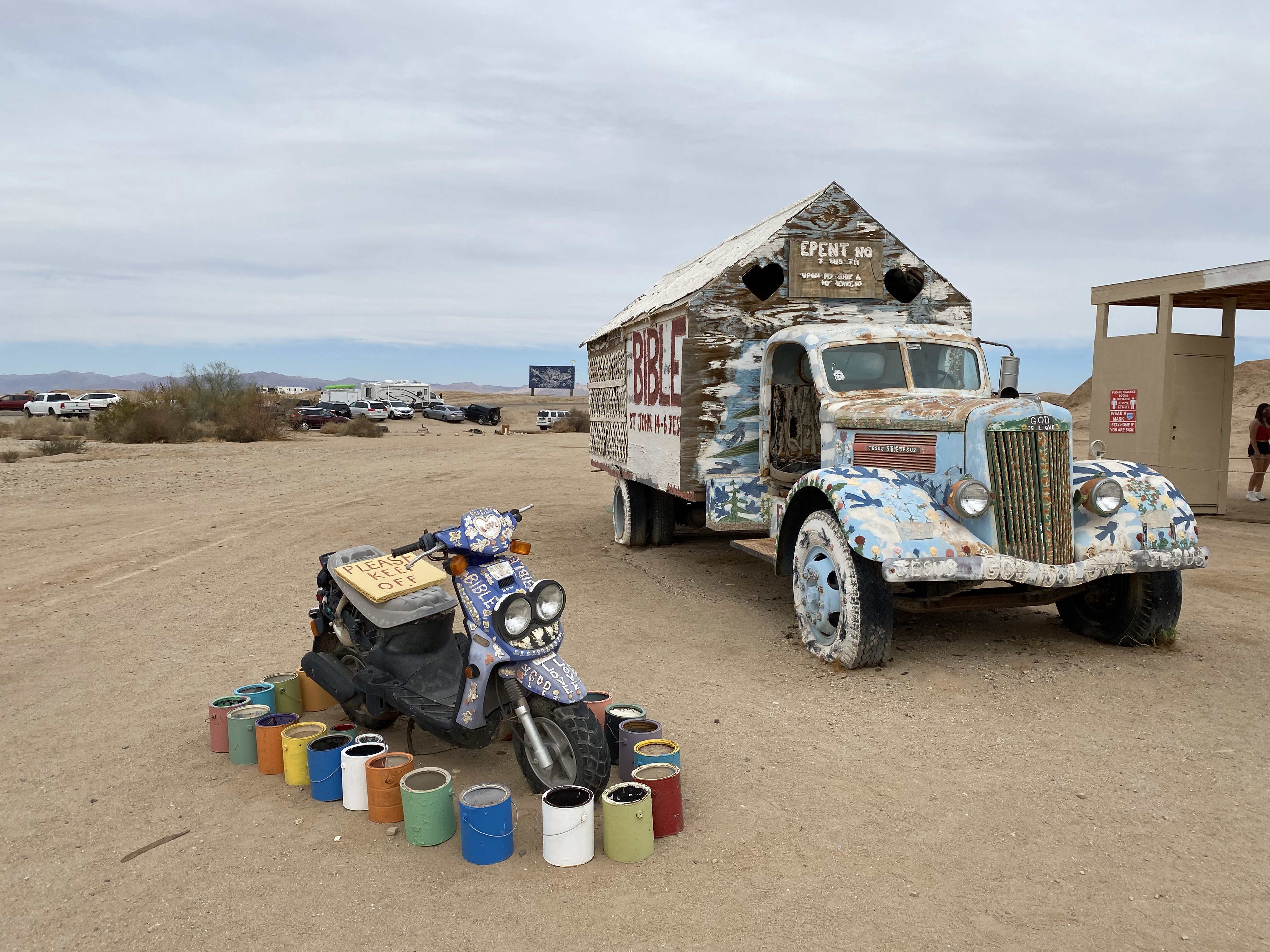 살베이션 마운틴은 수리공이었던 레너드 나이트(Leonard Knight)가 예수님의 사랑을 전하기 위해 점토, 버려진 타이어와 창문, 자동차 부품, 페인트를 이용해 만든 작품(?) 인데요.