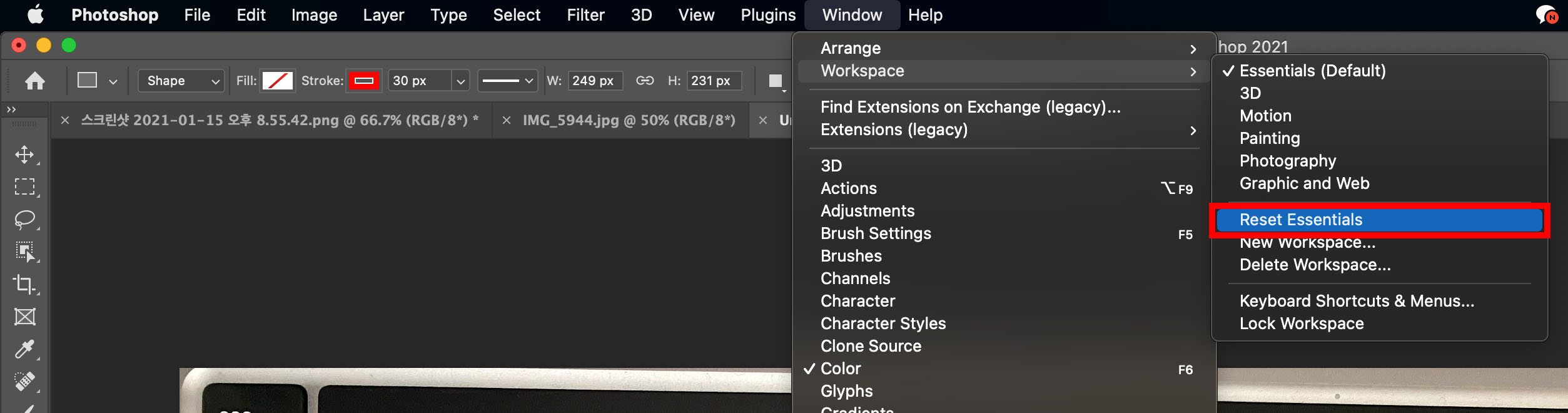 영문 : Window(W) → Workspace(K) → Reset Essentials(R)