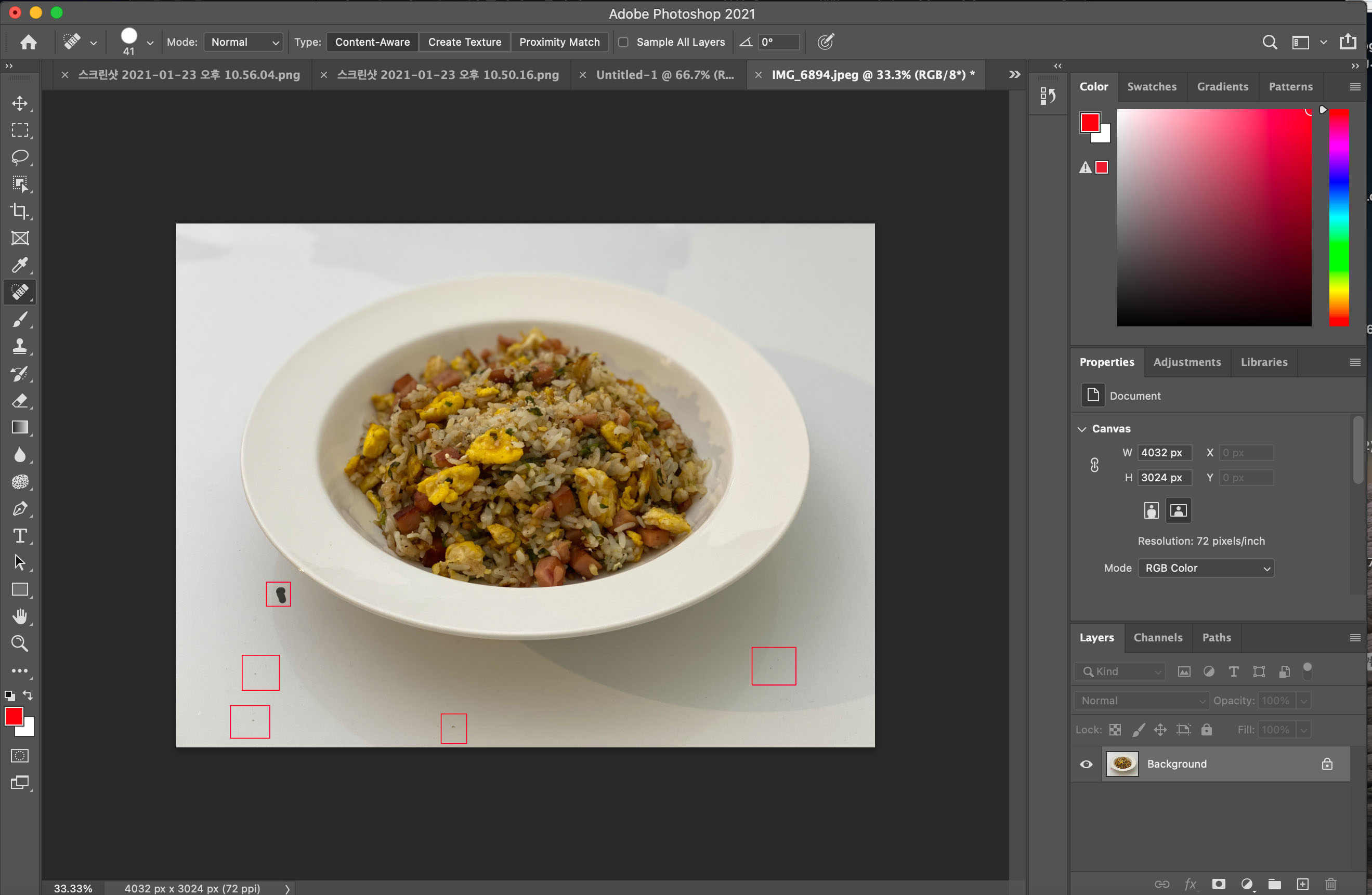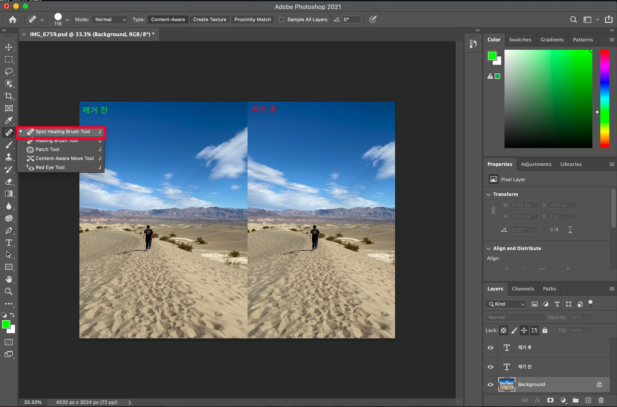 이럴 때 포토샵의 스팟 힐링 브러시 도구 (Spot Healing Brush Tool)를 이용하면